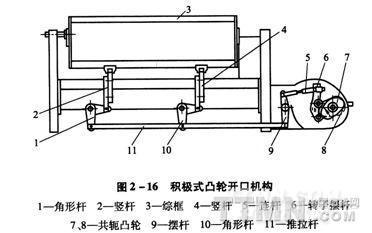 (2)積極式凸輪開口機(jī)構(gòu):為使開口運(yùn)動(dòng)更加平穩(wěn)和精確,尤其在織寬幅、重磅等織物時(shí),噴氣織機(jī)采用共軛凸輪開口機(jī)構(gòu),即積極式凸輪開口機(jī)構(gòu),如圖2—16所示。