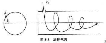 在圓形管道內形成渦流的方法有兩種:一是在高壓氣體作用下,氣流沿切線方向射入管道內,形成螺旋氣流,一邊繞軸心旋轉,一邊向出口推進(噴氣紡紗);第二種方法是用低真空抽引管道中的氣流,使管道內形成真空,氣流從管道的進風口以切線方向進入,形成旋轉氣流(渦流紡紗),如圖5—3所示。這種旋轉氣流的流動性質近似螺旋線,是一個旋轉渦流場,有切向速度、軸向速度和徑向速度。
