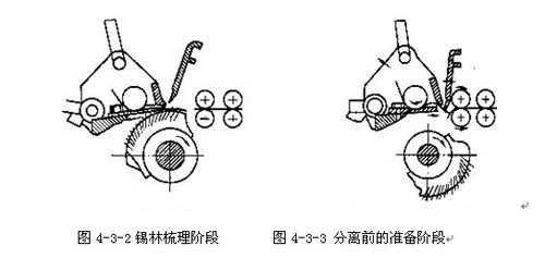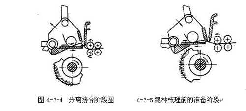 如圖4-3-5所示,錫林梳理前的準(zhǔn)備階段從分離結(jié)束到錫林梳理開始為止。本階段各主要機(jī)件的工作和運(yùn)動(dòng)情況為:上、下鉗板向后擺動(dòng),逐漸閉合;錫林第一排針逐漸接近鉗板下方,準(zhǔn)備梳理;給棉羅拉停止給棉;分離羅拉繼續(xù)順轉(zhuǎn)輸出棉網(wǎng),并逐漸趨向靜止;頂梳向后擺動(dòng),逐漸脫離須叢。