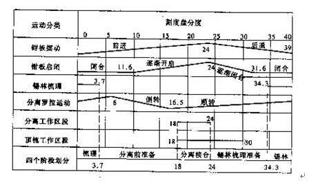如圖4-3-3所示,分離前的準(zhǔn)備階段從錫林梳理結(jié)束開始到開始分離為止。在這一階段各主要機(jī)件的工作和運(yùn)動(dòng)況為:上、下鉗板由閉合到逐漸開啟,鉗板繼續(xù)向前運(yùn)動(dòng);錫林梳理結(jié)束;給棉羅拉開始給棉;分離羅拉由靜止再到開始倒轉(zhuǎn),將棉網(wǎng)倒入機(jī)內(nèi),準(zhǔn)備與鉗板送來的纖維叢結(jié)合;頂梳繼續(xù)向前擺動(dòng),但仍未插入須叢梳理。