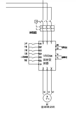 回轉(zhuǎn)部分采用V560高性能矢量變頻器,4kW,高精確的穩(wěn)速精度和快速響應(yīng)能保證回轉(zhuǎn)軟起軟停,并最大限度保護(hù)機(jī)械部分。接線圖如下: