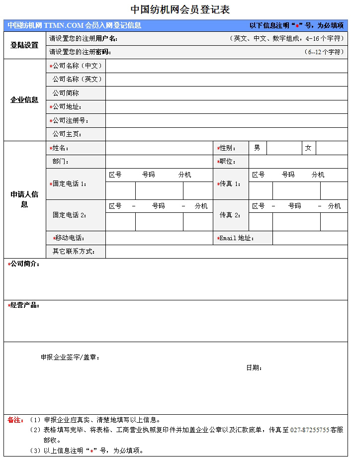 1、紡機網(wǎng)TTMN.COM會員為下載入網(wǎng)登記表以傳真方式注冊。(請點擊下載“企業(yè)會員登記表”)