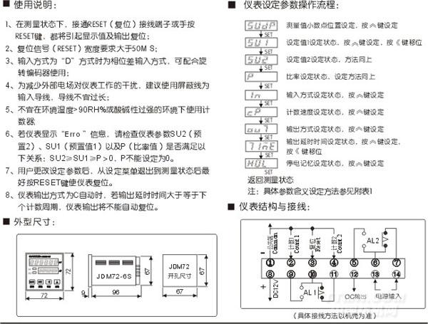 JDM72-6S計數(shù)、計米器以人性化、智能型為設(shè)計理念,內(nèi)含微處理器, 計數(shù)/預(yù)置數(shù)雙排LED顯示,設(shè)計先進、功能強大、抗干擾能力強、計數(shù)精度高、讀數(shù)直觀;并具有以脈沖當量為系數(shù),設(shè)定對應(yīng)計數(shù)值(即長度單位)可對計長精度進行精確修正的先進計長、計數(shù)功能。此外本計數(shù)器還具有下列先進功能: