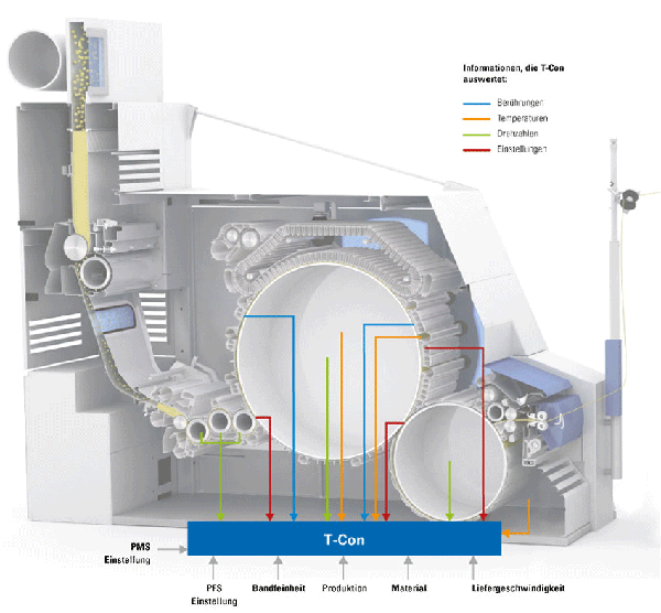 梳棉機(jī)產(chǎn)量的提高必定需要梳棉機(jī)的動(dòng)作增加,這些動(dòng)作會(huì)產(chǎn)生大量熱量。部分熱量隨著原料和吸風(fēng)被釋放。剩下的部分熱量導(dǎo)致梳棉機(jī)溫度明顯高于室溫。而溫度升高使梳棉機(jī)的部件產(chǎn)生不同程度膨脹,這對(duì)梳棉機(jī)工作元件的精確設(shè)定相當(dāng)不利。T-Con能夠基于工作狀態(tài)下的各個(gè)測量值客觀地計(jì)算梳理元件間的距離。計(jì)算結(jié)果顯示在梳棉機(jī)監(jiān)視器上,包括錫林和蓋板的梳理隔距,以及MULTI WEBCLEAN System的固定梳理元件與錫林的隔距。任何工程師都可以由此知曉當(dāng)前的實(shí)際設(shè)定,并使之最優(yōu)化。