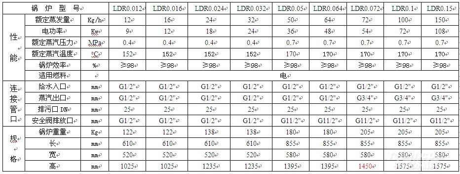 LDR電蒸汽鍋爐主要技術(shù)參數(shù)
