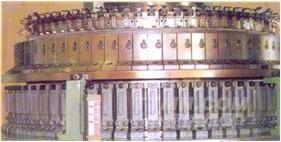 下筒 織針的選取由每一路有一個織針選取裝置,來選取選針而達成控制織針的目的,當選取裝置在左邊位置動作時,形成針筒織針做浮線(平針),當位置動作在右邊時,形成集圈(半針),位置動作于中間形成成圈(出針)。提花機采用三功位式37級撥片選針原理,當撥片在左、中、右時即可在同路上完浮線(MISS),成圈(IT),集圈(TUCK),而后生產出各式各樣雙面小提花織物。選針由37級組成,因此可依織物園樣選擇選針桿,依36為循環(huán)斜紋排列或加入第37級形成"V",為72循環(huán)排列。針盆織針選用兩段設計,可更換凌角來選擇織針在每一路為浮線,或是成圈、集圈之必要。此機樣變換花樣時,無需增加任何生產成本,更換快速容易。