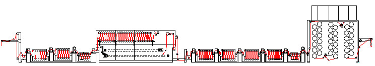 平幅進(jìn)布→浸漬槽→二輥軋車→水洗機(jī)→二輥軋車→水洗機(jī)→三輥軋車→平洗槽→二輥軋車→導(dǎo)輥汽蒸箱→浸漬槽→二輥軋車→水洗機(jī)→二輥軋車→水洗機(jī)→二輥軋車→水洗機(jī)→二輥軋車→水洗機(jī)→二輥軋車→平洗槽→三輥軋車→烘筒烘燥機(jī)→平幅落布