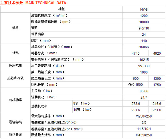 HY-8型高速彈力絲機是宏源公司根據(jù)國際上假捻變形技術的發(fā)展趨勢自主開發(fā)的新型全自動落筒型機。該產(chǎn)品的自動化、機電一體化程度很高,適應現(xiàn)代化企業(yè)的需要。最高機械速度達1200m/min。