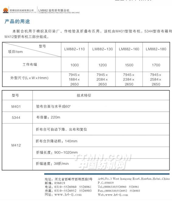 您所在的位置:紡機(jī)網(wǎng) >> 邯鄲紡織機(jī)械有限公司(邯鄲宏大化纖機(jī)械有限公司) >> LM882—110、130、160、180型驗(yàn)布折布聯(lián)合機(jī)