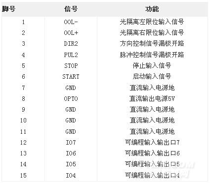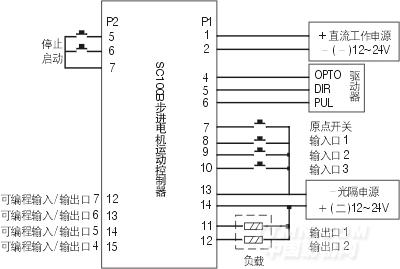 SC100B控制器提供兩個接口,P1口為14位接線柱,用于脈沖、方向、原點、3位輸入/2位輸出,所有信號經(jīng)光電隔離,11、12腳輸出可驅(qū)動高達0.5A的負載。P2接口提供啟動、停止、4位輸入/輸出。對I/O口需求多的用途,用戶可用P2口,如需光隔的P2口信號則需另外購買與P2口相配的轉(zhuǎn)接板。