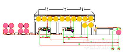 ASGA365E型漿紗機工藝流程示意圖(高架對角布局預(yù)烘烘燥機構(gòu)+雙浸四壓式上漿機構(gòu))