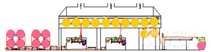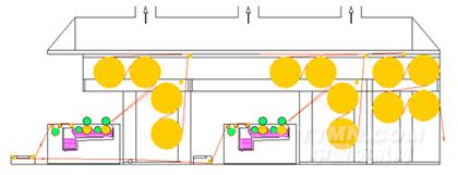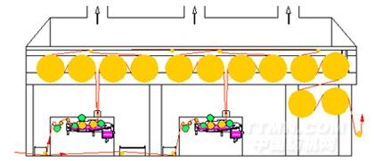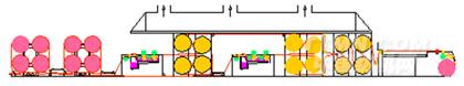 采用高架對角布局預(yù)烘烘燥機構(gòu)(專利號: )。由于預(yù)烘烘筒位于漿槽的側(cè)上方,有效減少了出漿槽濕紗長度,同時節(jié)省了設(shè)備安裝場地。