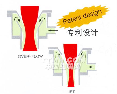 獨(dú)特角度設(shè)計(jì)的噴嘴,配合提布滾筒,實(shí)現(xiàn)溢流式的運(yùn)布方式,織物以自然狀態(tài)浮游于噴嘴中,避免起毛現(xiàn)象。