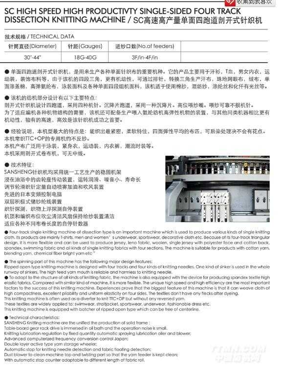 您所在的位置:紡機網(wǎng) >> >> SC高速高產(chǎn)量單面四跑道剖開式針織機